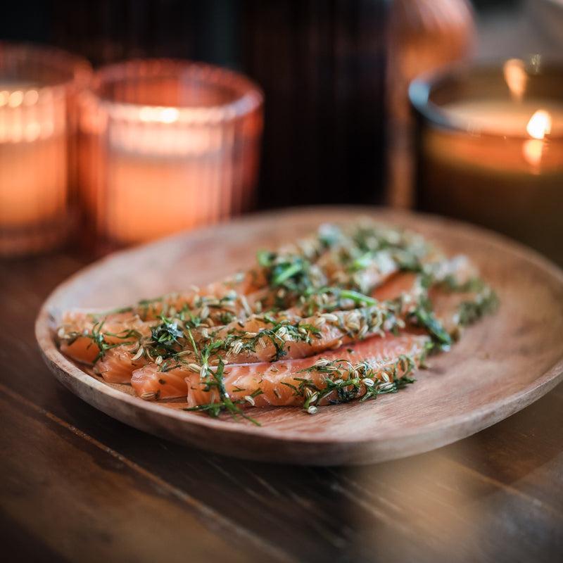 Salmone Reale alla Scandinava, onze huisgemarineerde zalm wordt bereid met dille en huisgedroogde kruiden. Geen klassieke gerookte zalm, maar een verfijnde bereiding die mooi balanceert tussen vers en licht gerookt. Fris, subtiel en elegant van smaak.